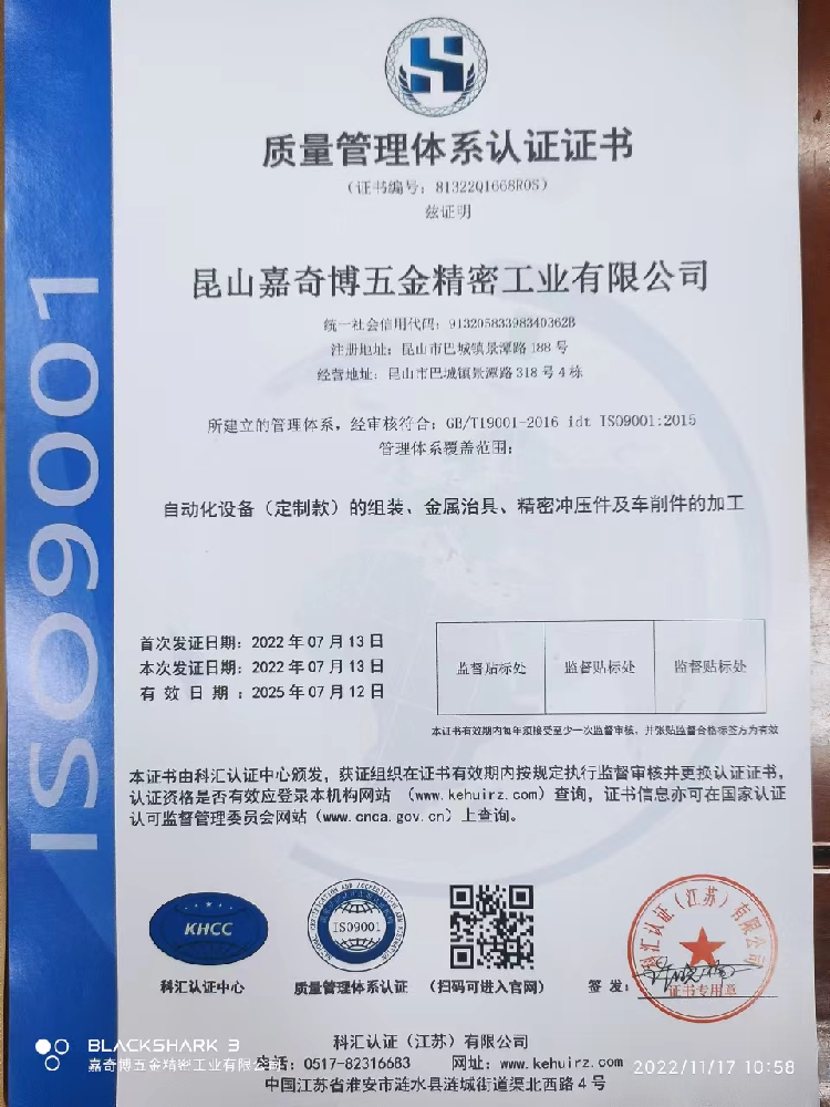 昆山嘉奇博五金精密工业有限公司成立于2014年,现已发展成为一家具备现代化技术的精密机械零件制造、以及自动化设备研发自制的公司。公司秉承“精准、迅速、品质、创新”的经营理念,在精密机械零件设计、CNC产品加工;工装夹具、过炉载具、冲压件 、车削件 、等模具设计制造;机械设备改进等领域具备较高的口碑,精湛的制造技术赢得了国内外客户的广泛赞誉。 公司拥有CNC加工中心、铣床、磨床、走心机、高速冲床、等各种机械加工设备,构成了完整的机加工综合制造能力。公司专业提供:车载、光伏、IGBT、碳化硅、半导体分立器件、精密组件设计生产一体化服务商,打造精品,树立品牌,不断满足广大客户的要求。